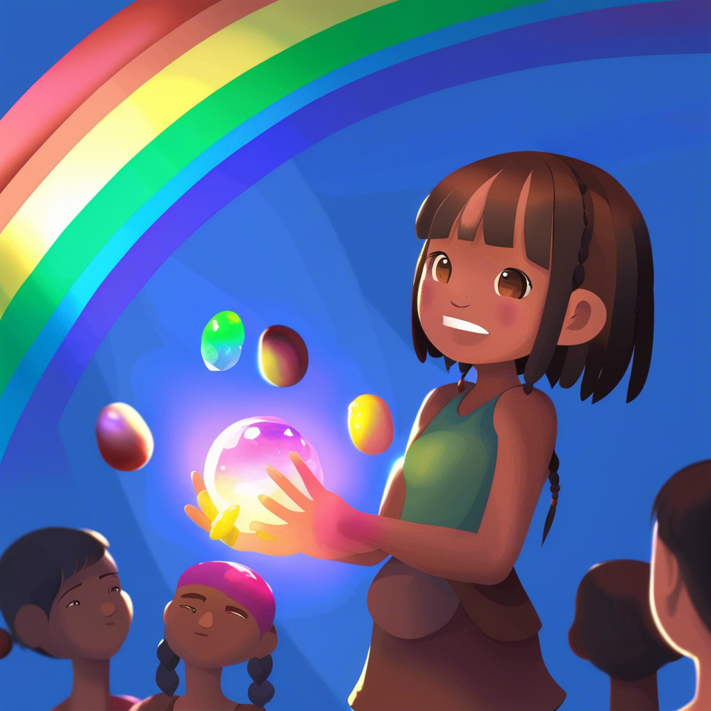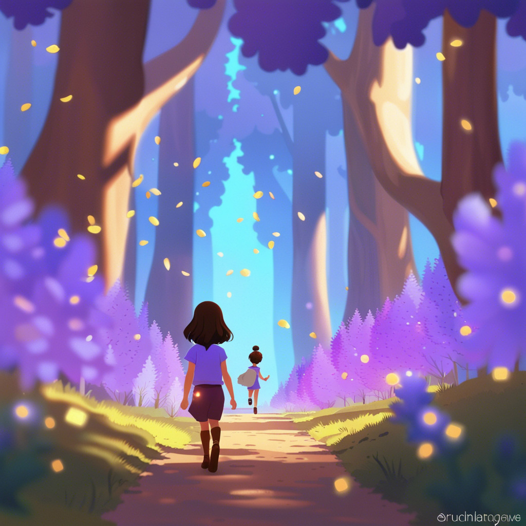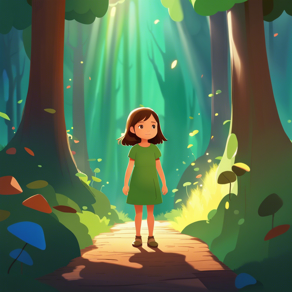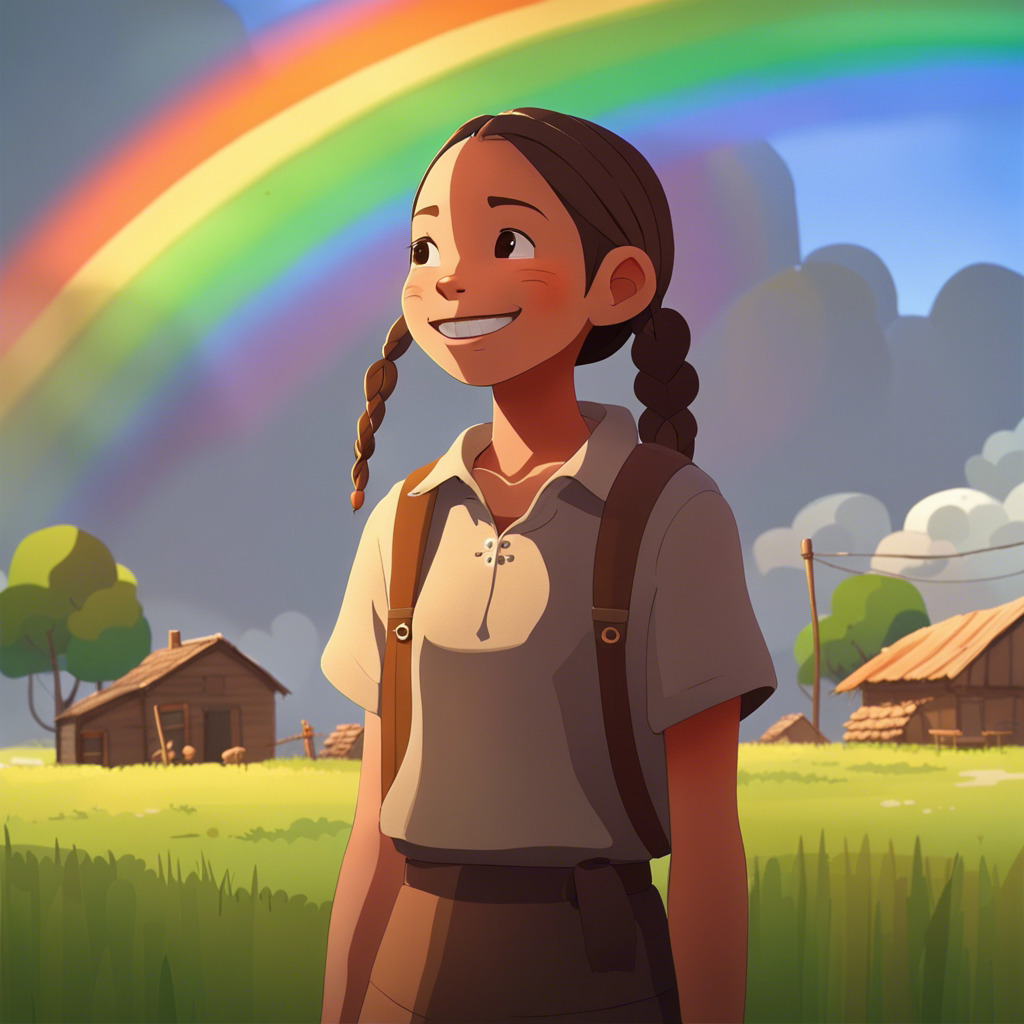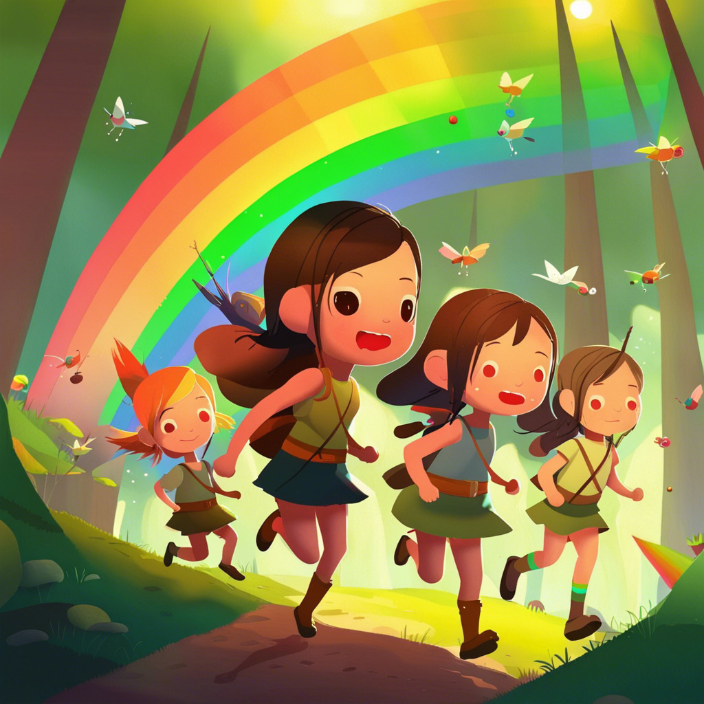 Once upon a time, in a peaceful village, lived a curious little girl named Florence. She had sparkling blue eyes, brown braids, and always wore her favorite green dress. One sunny morning, Florence noticed a vibrant rainbow spanning across the sky, ending in the deep forest nearby. A sense of adventure took hold of her, and she decided to find the end of the rainbow.