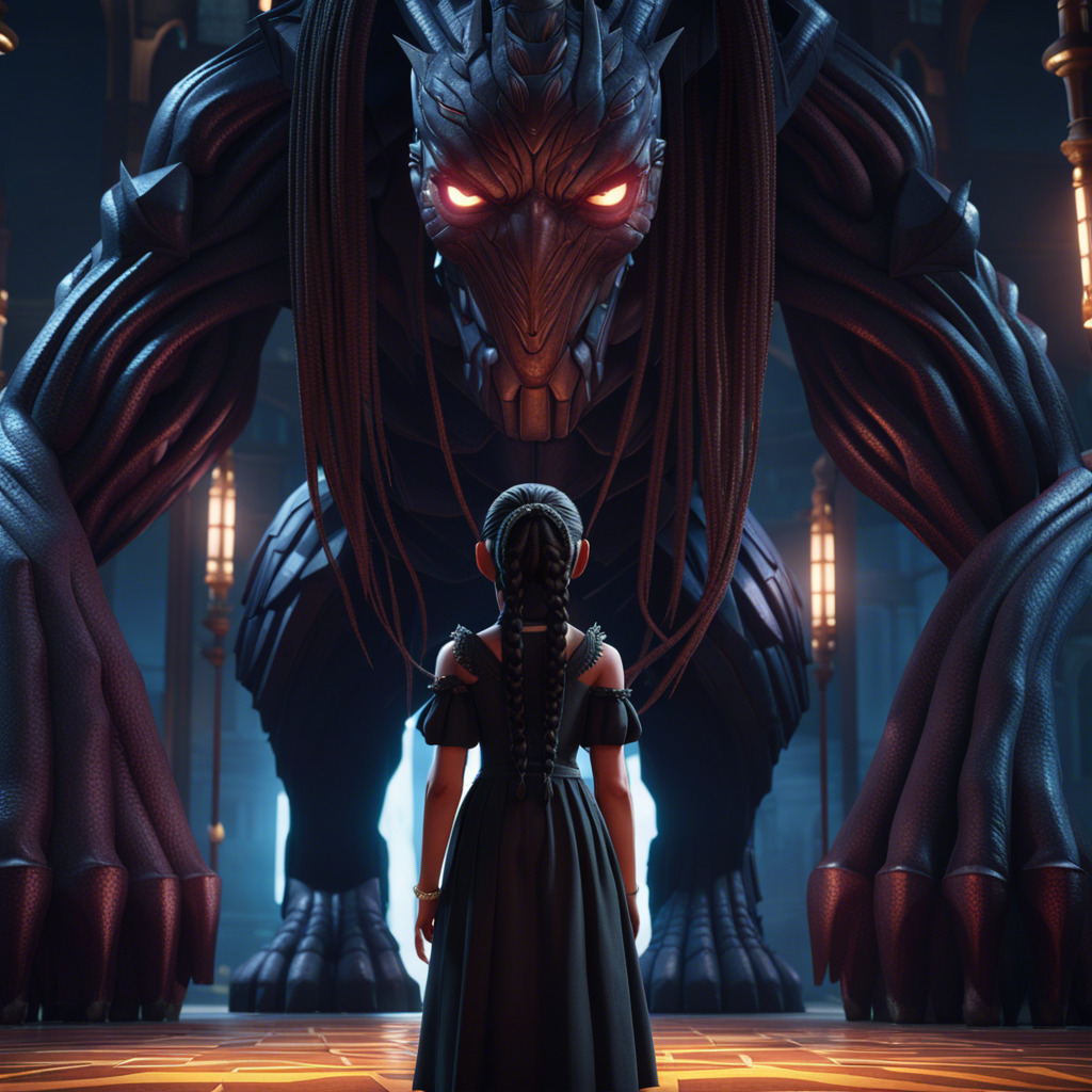 Finally, the day of the challenge arrived. The monstrous creature was a towering Gorgon with a body of steel and eyes that could turn anyone into stone. Wednesday, however, was not afraid. She faced the Gorgon bravely.